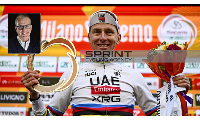 Tadej POGACAR. 10 e lode. Vince di un niente, lui che è tutto. Vince dopo essere caduto, dopo aver recuperato, spinto e attaccato come un ossesso. Ad occhio nudo è chiaramente il più forte, ma ci vuole un colpo di reni, un colpo d’ala per vincere finalmente la corsa che inseguiva da più tempo. Vince la sua quarta Monumento e al momento gli manca solo la Roubaix per completare la collezione. Celo celo celo celo, manca. Il collezionista cataloga, non accatasta. Sceglie, non accumula. Solo gemme preziose per questo prodigio del pedale che ha fatto piangere il Maestro di Cambiago, Ernesto Colnago, che in presa diretta chiama Eddy Merckx e assieme si raccontano emozioni lontane che questo ragazzo sloveno ha il potere di risvegliare. Sanremo urla la gioia. Un boato si leva nel cielo di questo primo giorno di primavera che non è canto, ma sinfonia vivaldiana. È primavera, svegliate i bambini: Pogi ha vinto! Non è una novità, ma stavolta è una primizia.