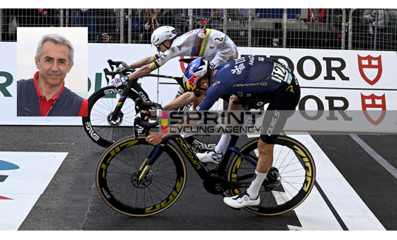 Sono sincero: grazie ai potenti mezzi e all'efficienza dell'organizzazione, che piazza dopo il traguardo i televisori per la stampa senza una sola immagine della Sanremo, vedo l'ultimo chilometro arrangiandomi accanto a Mauro Gianetti, il superboss Uae, ad Andrea Agostini, il viceboss, e a Vincenzo Nibali, ambasciatore del buon ciclismo, tutti dotati di telefonino collegato con l'app giusta. Guardo la volata inverosimile di quello in testa che non cede e di quello dietro che cerca la disperata rimonta, ma apprendo il nome del vincitore solo dalla baldoria che si scatena tra Gianetti e Agostini, subito sommersi dagli uomini in delirio della loro squadra.