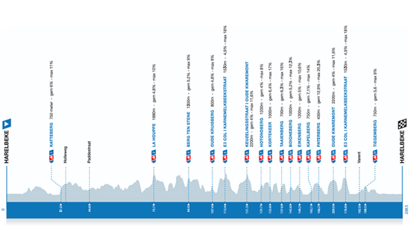 Partenza alle 12.45 e arrivo a Harelbeke dopo 208 chilometri, 16 Muri e 9 settori di pietre: un mix spietato di tratti in pavé, salite esplosive e passaggi tecnici dove ogni metro conta, ogni attacco ha un significato e ogni secondo può fare la differenza, e non è un'esagerazione. Il dislivello totale è aumentato da 2800 a 3000 metri, la corsa è più lunga di circa cinque chilometri e, soprattutto, il finale è più impegnativo. Anche per ragioni pratiche: qui non c'è la gara femminile ma quella juniores che l'anno scorso, a un certo punto, ha rischiato di sovrapporsi alla corsa WorldTour. Per evitare quel "momento di ansia", il passaggio attraverso Geraardsbergen è stato cancellato: si percorre la Paddenstraat direttamente verso La Houppe, la seconda salita di giornata. Un'altra novità è che la Karnemelkbeekstraat (ribattezzata E3-Col) e il Vecchio Kwaremont dovranno essere affrontati due volte, anche se quest'ultimo da due strade diverse. E al secondo giro si ripropone la combinazione con il Paterberg, come al Giro delle Fiandre. Il Vecchio Kwaremont si incontra dopo 121 e 169 chilometri, l'E3-Col per la prima volta dopo 113 e di nuovo dopo 176 chilometri. A quel punto mancherà solo il Tiegemberg, sedicesima e ultima salita, a 19 km dal traguardo classico di Harelbeke nelle vicinanze dello Stadio Forestier.