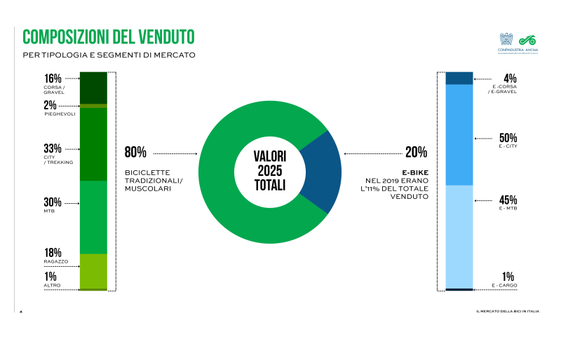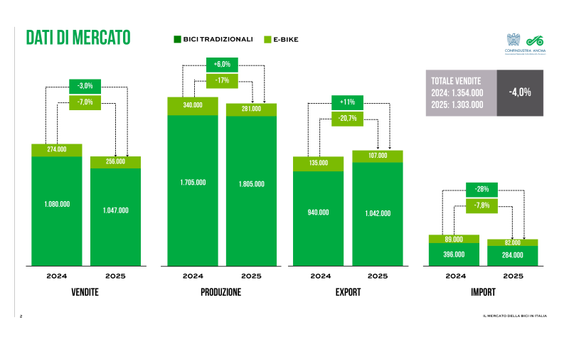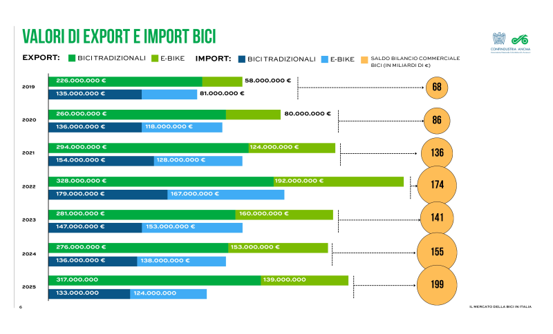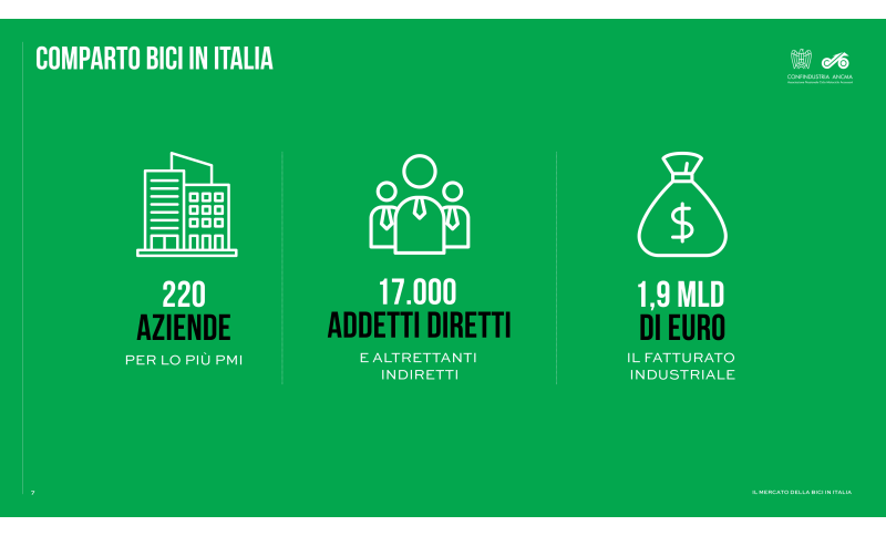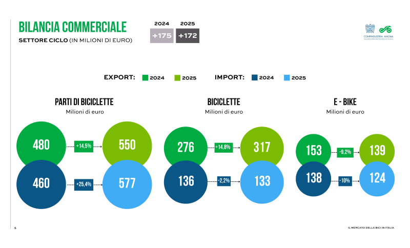 Emerge la difficoltà dei negozi specializzati, schiacciato dalla crisi generalizzata, dalla concorrenza dei canali on-line e dall'invasione incontrollata delle "finte bici elettriche che di fatto sono dei motorini". A ciò si aggiunge una cultura italiana che ancora considera la bici un mezzo di svago, sport e tempo libero, ma non ancora come un mezzo di trasporto analogo a tutti gli altri. Si conferma la tendenza del nostro Paese a essere un grande esportatore, con una bilancia commerciale che si mantiene oltre i 170 milioni di euro all'anno: frutto di un'industria ciclistica che conserva la propria eccellenza, con l'export delle biciclette tradizionali che fa registrare il +11% e l'export della componentistica che tocca il 14,5%.
