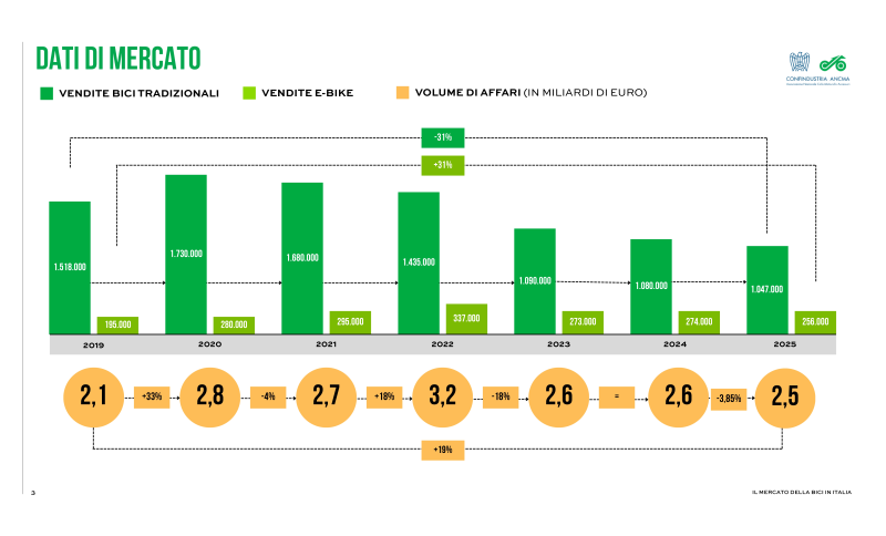 Presso lo stabilimento Pirelli al confine tra Bollate e Paderno Dugnano, il responsabile del settore ciclistico di Confindustria ANCMA (Associazione Nazionale Ciclo Motociclo Accessori) Piero Nigrelli ha illustrato i dati relativi all'andamento del mercato della bicicletta in Italia. In particolare evidenza il calo complessivo del 4% che prosegue la scia della saturazione del mercato, dove infatti a essere in aumento è il volume dell'usato mentre a diminuire maggiormente sono i numeri delle e-bike, dopo il boom degli anni scorsi.