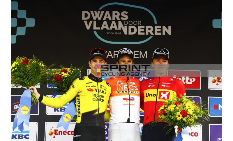 La Dwars door Vlaanderen è sempre stata una corsa entusiasmante e nel pomeriggio lo spettacolo è stato veramente di altissimo livello. Ganna questa corsa la voleva veramente e nonostante una foratura e un problema al manubrio, come in una lunga cronometro è riuscito a riportarsi su Wout van Aert, grande favorito di giornata e a tagliare per primo il traguardo. Le ultime due curve sono state decisive e sul rettilineo finale, il piemontese ha superato il belga andando a vincere la sua prima Classica fiamminga. «Non è stato facile nel finale e ho dovuto fare uno sforzo impressionante per riprendere Wout. È stata una giornata un po' sfortunata nella prima parte, dopo la prima caduta ho rotto la ruota anteriore e ho continuato, ma poi ho dovuto cambiare la bici e il manubrio. Fortunatamente poi è andata meglio e la fortuna è tornata a sorridermi».