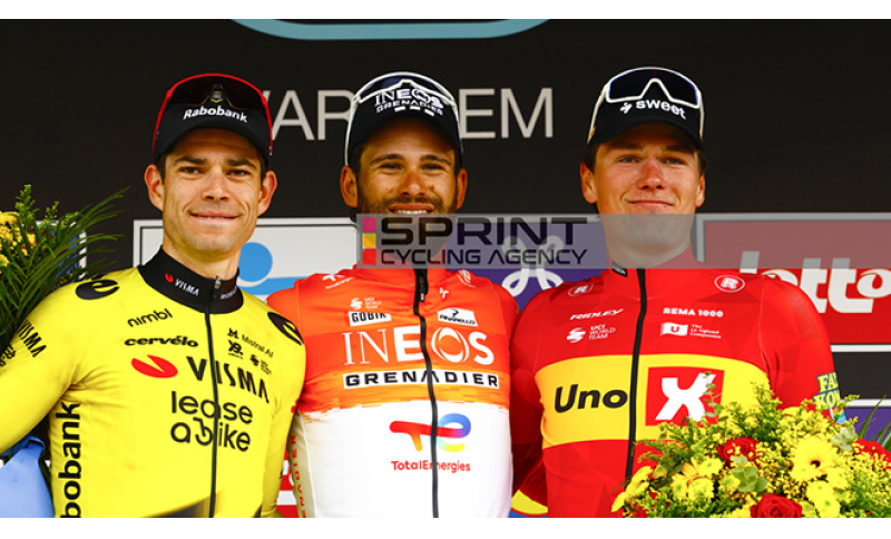 Il fiammingo della Visma -Lease a Bike a 25 chilometri dal finale era con Niklas Larsen (Unibet Rose Rockets) e Romain Grégoire (Groupama-FDJ). L’accelerata di van Aert sul Nokereberg, ha fatto staccare Grégoire e poi durante il secondo passaggio sul Nokereberg, superata la Waregemsestraat, il belga ha lanciato un'ultima accelerazione che ha fatto arrendere anche il corridore della Unibet Rose Rockets.
