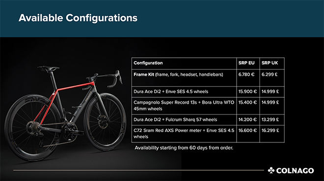 Il rosso è profondo e opaco, esattamente come il velluto del teatro, l’oro ricorda i dettagli raffinati e lo fa con l'emblema dell'Asso di Fiori goffrato e le varie applicazioni in foglia d'oro, gli stessi accenni che richiamano gli interni del teatro. Infine, spazio al bianco in una finitura marmorizzata che si ispira alle superfici tipiche della Scala. Questa edizione limitata è offerta al pubblico al prezzo di 22.000 € ed è disponibile per l'acquisto online o su richiesta presso una selezione curata di rivenditori autorizzati Colnago.