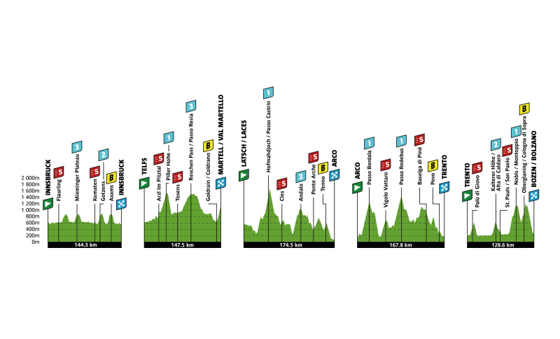 In ottica classifica generale le indicazioni arriveranno precise e puntuali il secondo giorno, che porterà il gruppo dal Tirolo all’Alto Adige, da Telfs a Val Martello per 147,5 km. Si affronta la salita di Pillerhôhe (9 km al 6,2%) in avvio e poi col Passo Resia (16 km al 3,3%) si torna in Italia. La tappa si farà però sulla salita conclusiva, che coi suoi 5 km all’8,9% è destinata a dare il primo verdetto. La scalata terminerà a 1500 metri dall’arrivo di Val Martello.