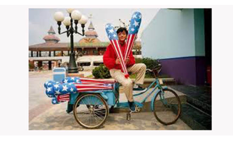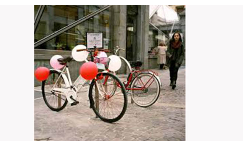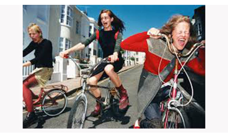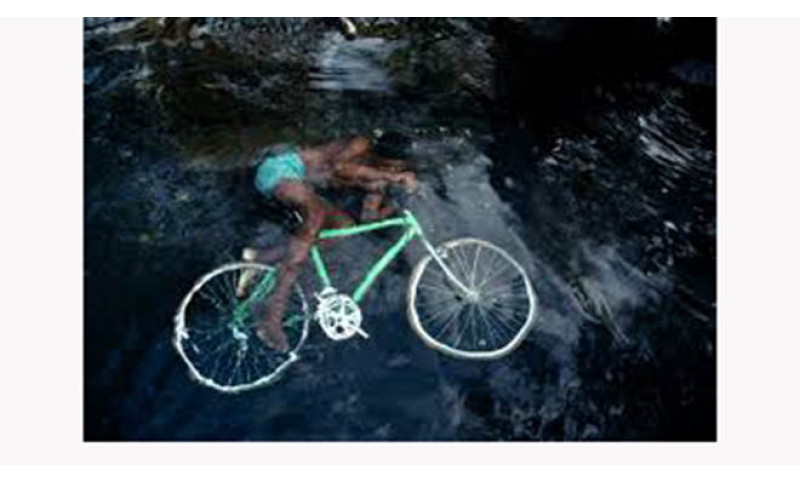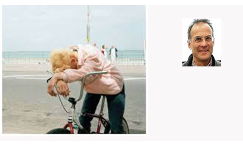 Nello sterminato patrimonio di opere di Parr, il ciclismo non c’è, ma le biciclette sì. E sono biciclette che abitano e respirano, che accompagnano e sorreggono, che testimoniano e certificano. Quella bici condotta a mano mentre un tuffatore sembra volare sulla sabbia, quelle bici con palloncini legati al telaio fuori da un negozio di estetica, quella bici che assiste a uno strano incontro, o incrocio, al mare…