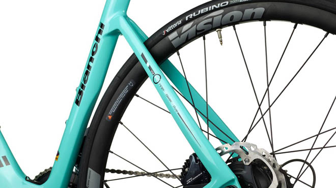 Aria e-Road è una bici moderna e aerodinamica, un prodotto che incarna lo spirito Bianchi con eleganza e sportività. La componentistica elettrica è perfettamente integrata e si può notare solo nel mozzo posteriore, infatti, la sottile batteria da 250Wh e larga solo 40mm trova spazio nel tubo obliquo mentre la porta di ricarica viene posta appena sopra il movimento centrale.