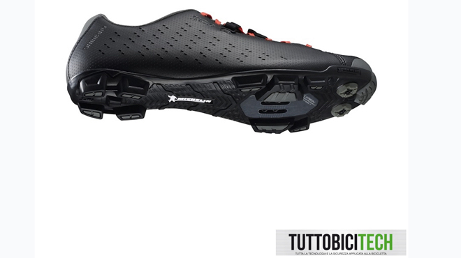 La tomaia è realizzata con un cuoio sintetico, un materiale che rimane comunque morbido al tatto e offre un piacevole comfort. Ad ampliare questa positiva sensazione ci pensa l’allacciatura classica con strap Mini Power, un ottimo compromesso per sfruttare tutta la stabilità della scarpa e lasciare il comfort giusto per i tratti fatti a piedi. La suola Michelin® è coadiuvata da una intersuola leggera e rigida con rinforzo in fibra di carbonio, il massimo per avere una pedalata redditizia visto l’indice di rigidità 7 raggiunto. Questa suola garantisce alta trazione anche sui terreni fangosi in cui i tasselli ampiamente distanziati fanno una bella differenza.