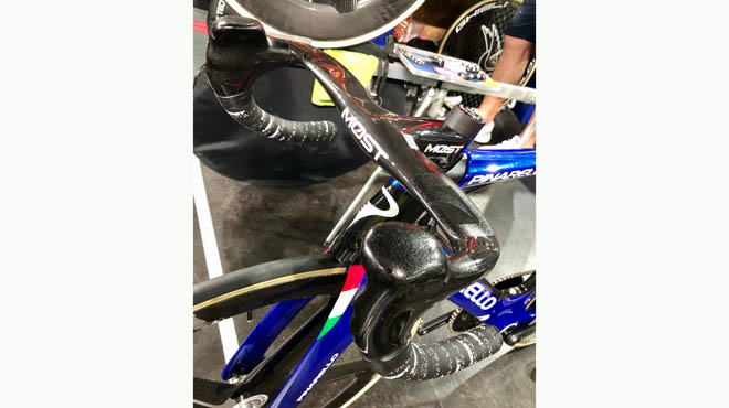 Il manubrio della bici per lo scratch e il madison di Simone Consonni: oramai è stata mutuata la posizione con le mani alte ideata dallo spagnolo Llaneras una decina di anni fa.