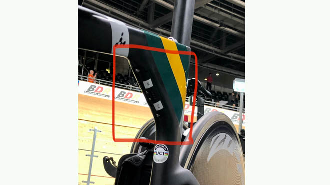 Particolare della bici da inseguimento del team australiano con supporto interno per la batteria necessaria al sistema di rilevamento dati