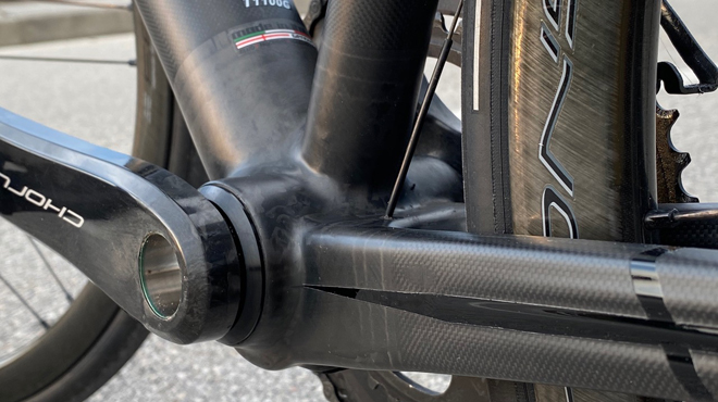 Essenziale, elegante e classico, questo telaio in fibra di carbonio porta nel 2020 la sontuosità dei gloriosi telai in acciaio. Il segreto di tanto equilibrio tra rigidità ed elasticità è da cercarsi certamente nella lavorazione del telaio e soprattutto nella tecnologia IWS ( qui i dettagli della lavorazione ) che consente a questo tube-to-tube su misura di ottenere valori di rigidità e compattezza incredibili prendendo le migliori caratteristiche tipiche dei telai monoscocca. La grafica è essenziale ed è giocata su un vago accento di luce attirato dalla vernice nera lucida mentre sullo sfondo domina la fibra di carbonio. La bandiera di San Giorgio tanto cara a Pedemonte ora vede il nero al posto del rosso ed è posta come al solito suoi foderi bassi, ma tutta l’appartenenza del marchio al territorio si ritrova con chiarezza anche nell’etichetta posta appena sopra il movimento centrale.