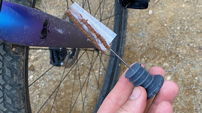 Aggiungete poi Tappabuco, lo strumento definitivo per riparare forature in pneumatici tubeless. Tappabuco è un vero kit di sopravvivenza antiforatura costituito da due tappi/terminali su cui vengono fissati due prolunghe metalliche (una via di mezzo tra una pinzetta e un ago) e due diverse serie di strisce di riparazione dette anche Spine. Basta infilare una spina nel foro, immettere ancora un po’ di gonfia e ripara e via, la foratura è dimenticata.
