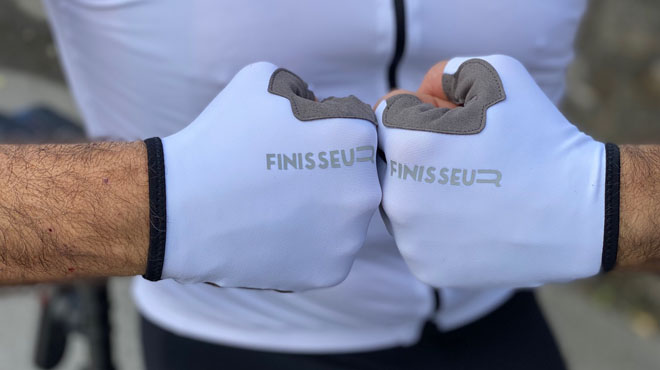 Il kit si chiude alla grande con Calze Finisseur con logo rosso, leggermente compressive nella zona del polpaccio e con i guanti Finisseur Pro Bianco ( 23.95€ ), realizzati con palmo in microfibra scamosciata e forata, con dita separate da linguetta per facilitare l’estrazione. Il polsino elastico privo di velcro è ottimo ed è amico di tutti i tessuti! Sono guanti stagionali per quanto mi riguarda, vanno usati e spremuti durante la primavera estate e poi messi da parte. Nel complesso il completo stacca buoni voti sotto molti punti. In primis il colore della maglia, un bianco estivo che non attira il calore e può contare su una protezione solare UPF +50.