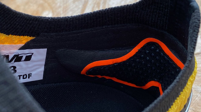 La tomaia non è tutta uguale, questo sia chiaro. Gli spessori sono ben organizzati e lo schema viene stabilito per offrire un contenimento corretto e ottima traspirabilità. In punta e sui lati è possibile avvertire l’ingresso dell’aria nella scarpa, una ventilazione piacevole che vi accompagna dalla primavera fino all’autunno. La struttura a maglia sagoma benissimo tutta la parte intorno alla caviglia, un avvolgimento che ritraduce sempre in vero comfort. Una volta indossata, la scarpa calza comodissima e non si muove di un mm, merito dei lacci, della tomaia ma anche di alcune accortezze adottate nella zona del tallone. Qui, viene definita internamente una area con rilievi in silicone per evitare la scalzata a chi probabilmente deve fare i conti con un numero o un mezzo numero che non sono probabilmente suoi, possibilità che reputo remota ma tutto può capitare.