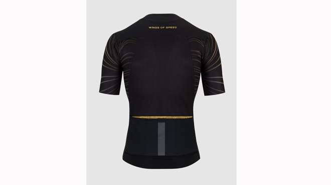 Inutile negarlo, la maglia “Targa” parla il puro linguaggio della velocità e in questa edizione limitata Wings of Speed si esalta anche dal punto di vista aerodinamico. Il tessuto ultraleggero a maglia 3D permette asciugatura in tempi rapidi e una traspirabilità incredibile, pur garantendo una protezione solare UPF 25. Maniche e tasche invece sono realizzate con tessuto altamente elasticizzato, un tessuto che assicura una sensazione di avvolgimento decisamente piacevole. In questo caso, la protezione solare arriva a 50+. Il pannello posteriore sfrutta le qualità stabilizzanti del tessuto per fare in modo che le tasche piene non provochino fastidiosi allungamenti. Ovviamente questa maglia è prodotta da Assos anche nella versione femminile.