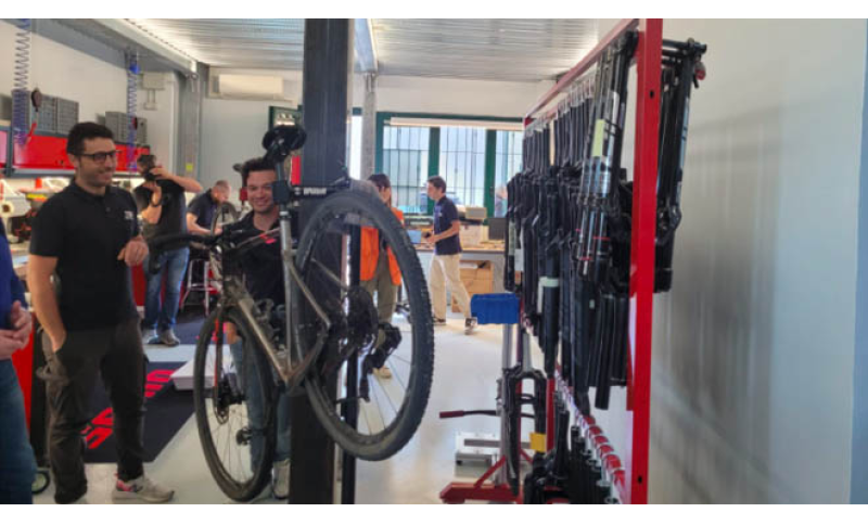 Dopodiché, guidati da Salvatore Miceli e Alice Beltrami, insieme ad Alvise Rizzi e Mirko Porta di Sram Italia, abbiamo scoperto qualcosa di più su questo spazio appena aperto, nato dalla necessità di assicurare una vicinanza al cliente maggiore e capillare: Rock Shox, Truvariv, Zipp, Quarq e Time sono i marchi Sram coinvolti. Si tratta di 200 metri quadrati di officina, dieci postazioni per i meccanici, un magazzino meccanizzato e un laboratorio per la formazione del personale. Per l'interazione riservata e puntuale coi negozianti, inoltre, un software con area dedicata.