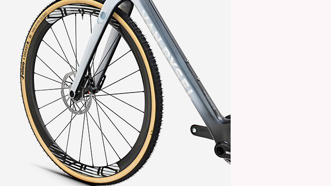 i designer del team Van Rysel hanno lavorato per dare un senso alla verniciatura, uno schema quello della RCX 2 PRO North che prevede una parte anteriore chiarissima che va a sfumarsi verso il retro per diventare totalmente nera. Questa transizione rappresenta la luce che abbaglia, un argento brillante che trova risalto sui dettagli riflettenti posizionati sui cerchi.