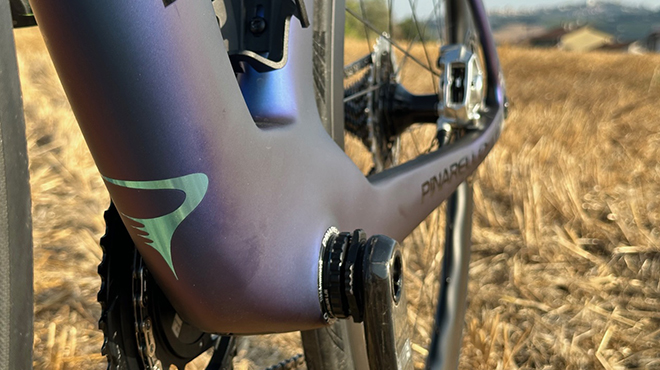 A mio avviso è nella sua parte frontale che Dogma F si conferma una bici di grandissimo carattere. Il nuovo tubo sterzo ha volumi più ridotti e migliorato è anche il profilo dell’obliquo che scende verso la zona del movimento centrale, una struttura rigidissima e ora anche più aero che in passato ( prestazioni aerodinamiche migliorate del 1,2% ). La forcella, come del resto accade per l’intero telaio, manifesta particolari asimmetrie, la soluzione visibile con cui Pinarello permette ad ogni zona di rispondere a dovere alle varie sollecitazioni che riceve. Vale per il tiro catena, ma anche per le forze frenanti. Detto questo, la nuova forcella adotta un design più sottile ed è più aerodinamica e con un rake da 47mm regala sempre tanta maneggevolezza.