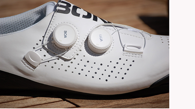 In passato la tomaia piuttosto rigida poteva essere un difetto per alcuni utilizzatori, ma oggi tutto è cambiato e la nuova tomaia realizzata in Durolite è leggerissima e morbida. Resta protagonista la chiusura affidata a due rotelle BOA® Li2, di cui quella superiore posizionata sulla linguetta che rende la scarpa anche aerodinamica. Il tacco è sostituibile mentre la punta è ben avvolta in una pratica protezione gommata. La scarpa nel complesso è leggerissima e traspirante, infine, gran parte della sua comodità va attribuita alla soletta interna in schiuma Cobra9 in EVA a due diverse densità.