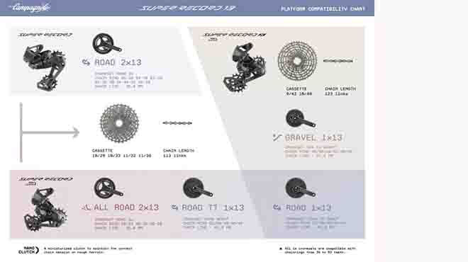 Il Super Record 13 Road, gruppo disponibile da giugno 2025 è velocissimo ed è il primo ad offrire 2x13 velocità. Grazie ad una ergonomia riprogettate e a cambiate precise e veloci ha davvero molto da offrire. Lo stesso gruppo prevede anche la soluzione 1x13, ovvero la combinazione con monocorona stradale. Nano Clutch per la catena sempre in tensione e ben cinque guarniture aero (44, 46, 48, 50, 52 ). Infine, spazio per il Super Record TT 1x13, la configurazione per per prove contro il tempo. Super Record Gravel prevede i Super Record X 1x13 con cassette fino a 48 denti e ben otto guarniture aero full-structure ( 38, 40, 42, 44, 46, 48. 50, 52 ). Resta come ultima combinazione la Super Record 13 All Road nella soluzione 2x13, l’ideale per chi vuole alternare un uso stradale a quello off-road. Sono 7 le combinazioni di corone e 4 i differenti pacchi pignoni come la versione stradale 2x13. Parole a parte, Campagnolo mette in questa piattaforma innovativa tantissima sostanza, idee originali e tutta la qualità e l’innovazione che da sempre la caratterizzano.