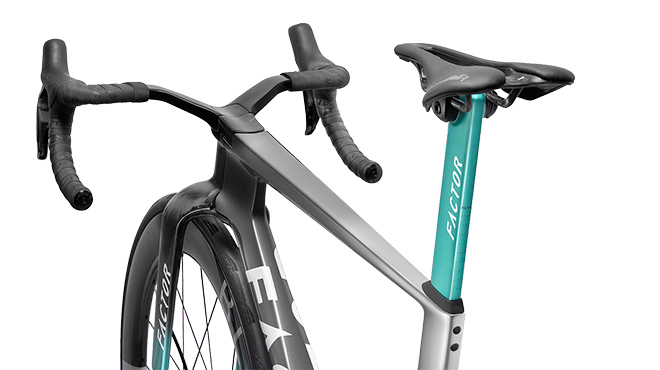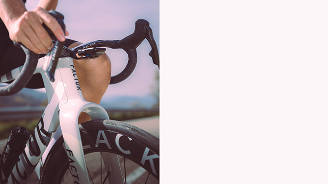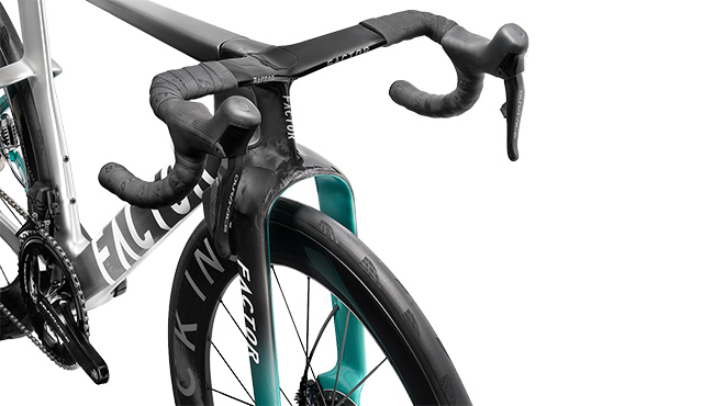 Cambia il controllo del flusso dell’aria, infatti, il sistema messo a punto da Factor riduce la resistenza aerodinamica e mantiene i vantaggi acquisiti anche oltre i 15° di imbardata, dove altri telai aerodinamici iniziano a perdere i loro vantaggi. Gli ingegneri Factor hanno anche ideato un sistema per favorire chi ricerca posizioni sempre più aggressive svincolando l’attacco manubrio dall’asse originale dello sterzo. Tutto questo viene ottimizzato per una posizione che prevede pedivelle più corte e porta l’atleta ad essere più raccolto e aerodinamico rispetto a quanto succedeva con la Ostro VAM 2.0. Ovviamente la nuova forcella ed il nuovo manubrio sono stati ottimizzati per fare in modo che la bici sia stabile alle alte velocità ma anche precisa e agile nella guida. I foderi larghi e allungati creano flussi puliti che lavorano meglio con il movimento delle gambe, inoltre, in questa configurazione lavorano meglio anche le ruote. Difficile togliere gli occhi da quella forcella e da quel frontale cosi massiccio e aerodinamico, la nuova Facton ONE porta su strada accorgimenti che abbiamo visto solo in pista e lo fa offrendo una guida reattiva ed emozionante. Il frontale è qualcosa di magnifico, un inno all’aerodinamicità. Ad impressionare è soprattutto quello che potremmo forse definire ancora il tubo sterzo, allungato e piatto come nessun altro.