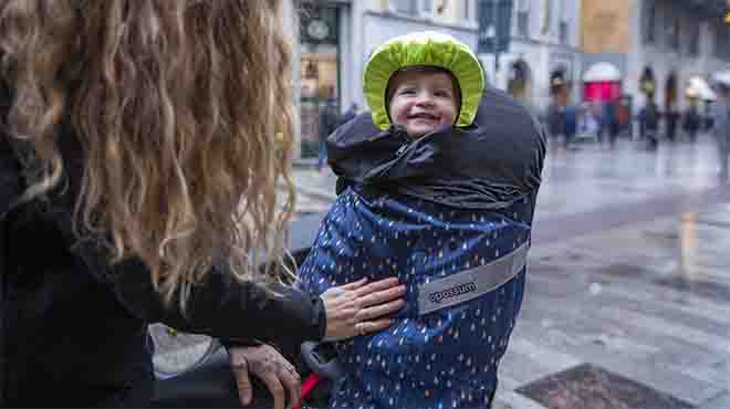 Compatibile con i seggiolini posteriori da bicicletta più diffusi sul mercato, OPOSSUM®protegge da vento e freddo grazie sia al suo tessuto antivento e impermeabile con 5K di colonna d’acqua sia alla fodera imbottita in eco-pelliccia. Se poi all’improvviso arriva la pioggia, basta estrarre dal marsupio frontale la comoda mantellina antipioggia integrata e, TAAC, il bimbo rimane all’asciutto. In più, una volta parcheggiata la bici, la mantellina si trasforma in copri-seggiolino per avere una seduta sempre pulita e pronta all’uso.