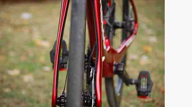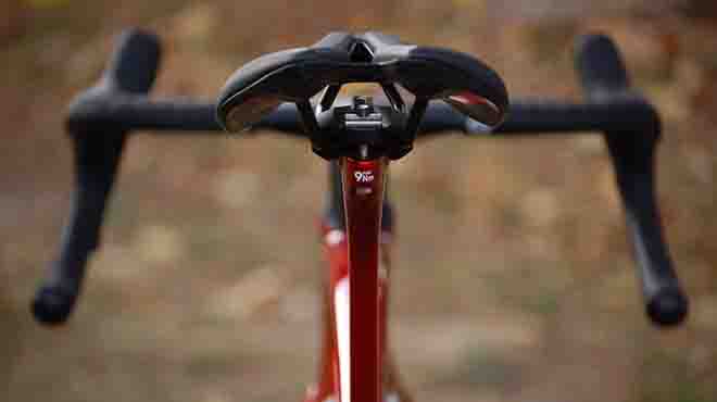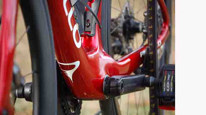 Il tubo obliquo riceve l’incavo lato borraccia che abbiamo già visto sulla Dogma F e ha un compito aerodinamico notevole, infatti, deve proteggere le borracce dall’aria, infine, impera una zona del movimento centrale importante ( AERO KELL BB ), una vera “deriva” aerodinamica di rara bellezza. In queste proporzioni si trovano grandi somiglianze con la sorella maggiore anche se i concetti e le dimensioni non sono così estremizzati. Il nuovo reggisella è stato ideato per offrire comfort e lo fa con un buon grado di flessione che permette alle asperità di sembrare meno secche. Il caro come vuole la prassi è asimmetrico mentre ben bilanciato è tutto la parte alta del triangolo posteriore. La clearance si ferma a 32mm, una misura che vi permette di spaziare sfruttando le migliori coperture presenti sul mercato, sia in versione tubeless che per camera d’aria.
