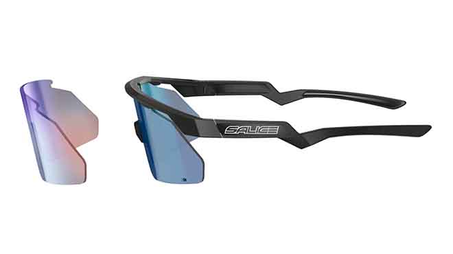 La lente è agganciata al frame nella sua parte frontale, mentre le aste partono in maniera tradizionale, quella dove è posto il marchio Salice, per poi assottigliarsi e incurvarsi per abbinarsi al millimetro alla forma della testa in prossimità delle orecchie. Salice ha ovviamente perfezionato queste forme per ottenere un duplice vantaggio, infatti, oltre a migliorare la stabilità si ottiene anche un ulteriore alleggerimento. Montatura ed aste sono stampate in Grilamid, una materiale resistente e leggero, infine, troviamo un nasello modellabile ( qui si fissa il Kit Opti B6 per le lenti correttive ) rivestito in Megol, esattamente come accade sulla porzione terminale delle aste.