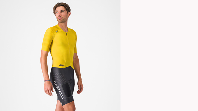 Esattamente come accade per ogni capo Rosso Corsa. Unlimited Speedsuit è il body di ultima generazione che abbina la maglia Unlimited Pro 2 ai pantaloncini Free Aero Race S, i pantaloncini più veloci e comodi realizzati da Castelli. Nel bib troviamo il nuovo tessuto aerodinamico ed elasticizzato Forza2, un tessuto che unitamente al taglio aero garantisce una riduzione del 3% del coefficiente di resistenza aerodinamica (CdA). A livello di comfort spicca il fondello Progetto X2 Air Seamless, il massimo anche per le uscite ultra chilometriche. In questo bib sono presenti tasche sulla parte anteriore, una scelta realizzata per facilitare l’alimentazione in corsa. e per massimizzare la resa aerodinamica, del resto, le mani si possono allontanare per pochi istanti dal manubrio.