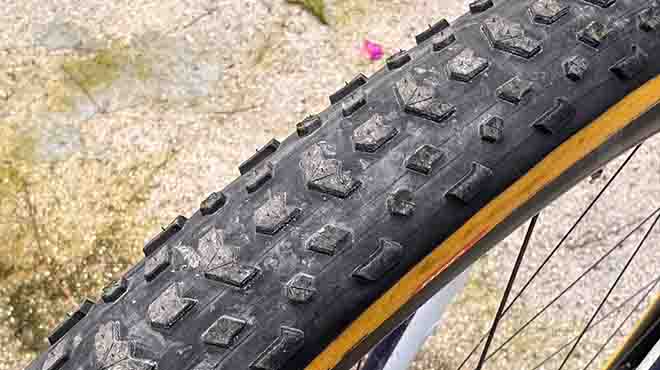 Colle naturali, lattice ed una super mescola SmartPlus fanno in modo che grip e rotolamento siano sempre da riferimento. La mescola si rivela non solo ben bilanciata per offrire giusto grip e facile rotolamento, ma sopporta ben l’usura con tasselli che mantengono, pur consumandosi, profili abbastanza netti. Per quanto riguarda la protezione contro le forature il lavoro dello strato aggiuntivo PSS ( tessuto finemente intrecciato ) posto tra carcassa e battistrada ha fatto il suo dovere con 1800 km percorsi fino adesso in situazioni anche difficili con zero forature. Questa protezione non ostacola la deformazione della carcassa e non appesantisce il Gravine Pro-Handmade TLR, uno pneumatico che pesa circa 560 grammi nella misura da 45.
