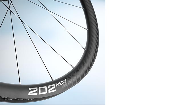 I cerchi 202 NSW sono abbinati ai mozzi ZR1 SL di progettazione tedesca e a raggi Alpina Hyperlite ( 20 raggi con incrocio in seconda ). I cuscinetti sono ceramici GRW mentre la ruota libera sfrutta ben 66 punti di contatto per innesti istantanei.