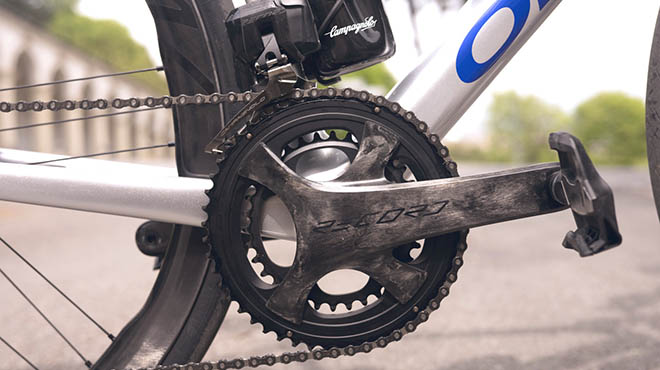 Guarnitura: la stessa piattaforma, accesso più ampio Le corone Record 13 sono condivise con il Super Record 13 (7 combinazioni per il 2x e 8 opzioni aero per l'1x). La differenza principale risiede nel perno, realizzato in acciaio inossidabile anziché in titanio. La pedivella in carbonio, a differenza della versione Super Record cava, presenta un'area interna riempita con un tecnopolimero a bassissima densità, mantenendo eccellenti livelli di leggerezza e rigidezza. Disponibile anche con misuratore di potenza integrato (Record PWM), con precisione del ±2%.