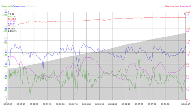 Fig. 2 – Brinzio. 15’31” a 243 W medi (4,42 W/kg), 1005 m/h VAM.