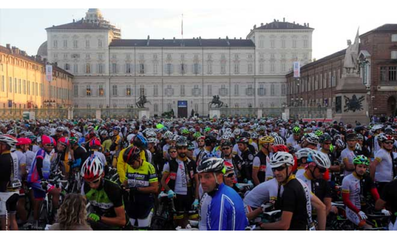 Un colpo d'occhio senza pari è stata la vasta massa di ciclisti, vestiti con la maglia ufficiale della manifestazione, ospitati nelle griglie a serpentina. A guardare incuriositi tutti questi cavalieri e i loro cavalli in carbonio sono stati Palazzo Reale e Palazzo Madama, ancora memori delle riunioni risorgimentali dedicate all'Unità d'Italia.