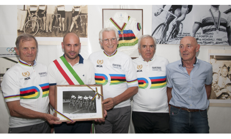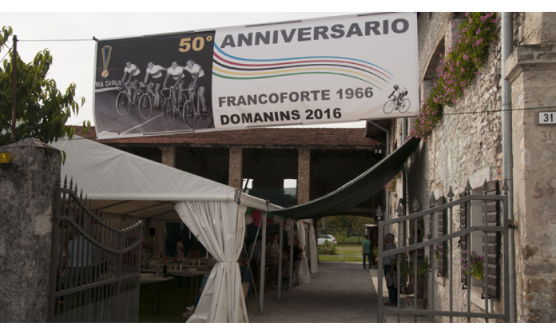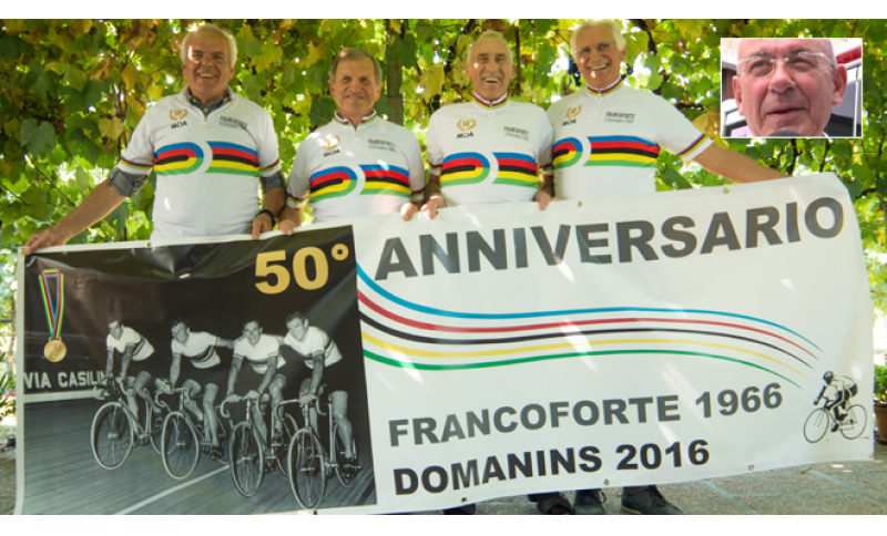 E’ pienamente riuscito l’incontro dello scorso 4 settembre del quartetto azzurro che ha conquistato l’iride nell’inseguimento sulla pista di Francoforte, in Germania, nel 1966. A distanza di mezzo secolo dalla prestigiosa vittoria, i protagonisti si sono ritrovati a casa di Gino Pancino, a Domanins, frazione del comune di San Giorgio della Richinvelda, in Friuli-Venezia Giulia – incontro peraltro non infrequente – per celebrare con sobria cordialità, in stile friulano, l’importante ricorrenza. Con Gino Pancino erano presenti il romano Antonio Castello e il mantovano Luigi Roncaglia. Mancava purtroppo il veneto Cipriano Chemello, ricoverato in ospedale a Padova che dopo qualche giorno ha ricevuto la visita e i saluti dei suoi altri tre compagni iridati.