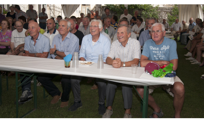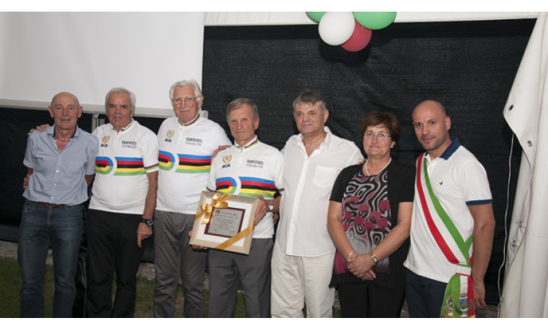 I protagonisti hanno indossato la maglia iridata, con taglia “aggiornata” (ma poi neanche tanto in verità), posato per le foto di rito con la festa che è andata avanti, fra brindisi con l’ottimo vino del territorio, assaggi di specialità della zona, e sempre con un pensiero per l’amico Cipriano Chemello, impossibilitato, a essere presente di persona ma presente nell’amicizia e nell’affetto.