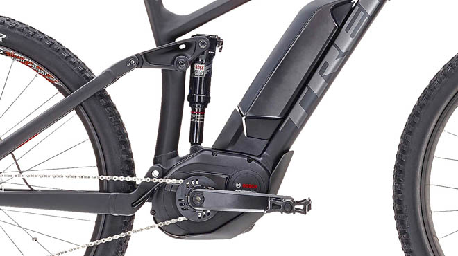 Il reparto sospensioni è affidato a RoskShox con la forcella Sextor Silver RL da 130 all’anteriore e il RockShox Deluxe RL da 200mm al posteriore mentre per le ruote la scelta è ricaduta sulle Bontrager XR850 da 27.5”. Cassetta (11-34 da 9 velocità), deragliatore posteriore e leve sono di Shimano e puntano tutto sulla robustezza e l’efficacia. Anche nei passaggi più difficili non dovrete temere di danneggiare il motore poiché questo è protetto da una robusta protezione che farà sempre il suo mestiere.