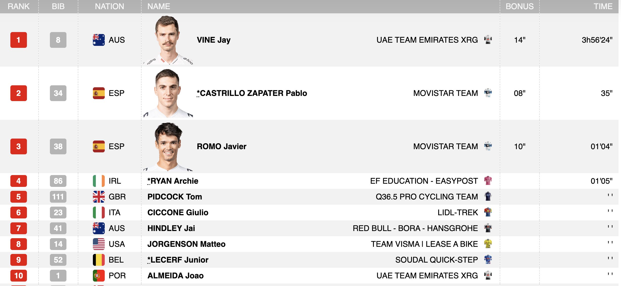 Dietro ad inseguirlo rimangono Vine, Conci, Bernard, Romo, Castrillo e Ryan