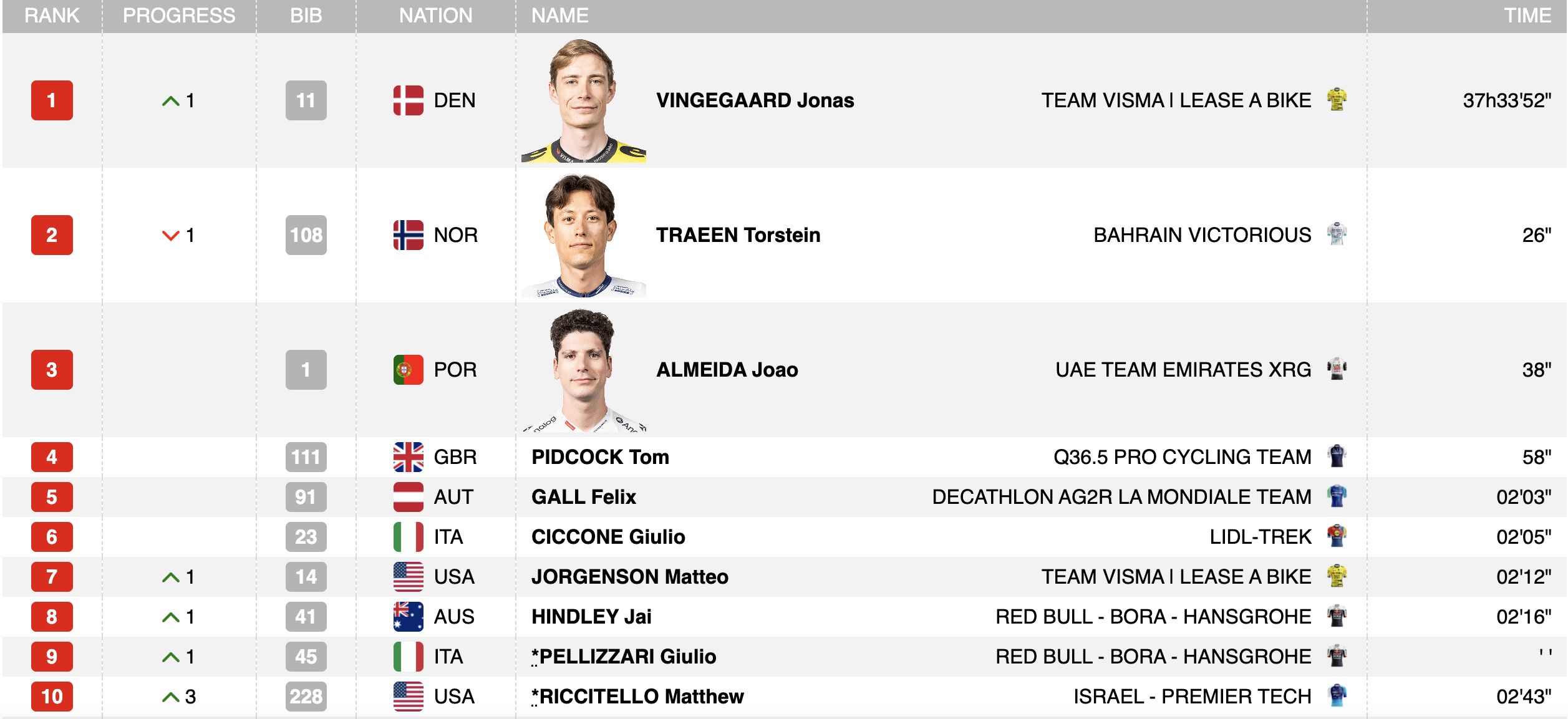 E la nuova classifica generale, con Vingegaard che torna in rosso