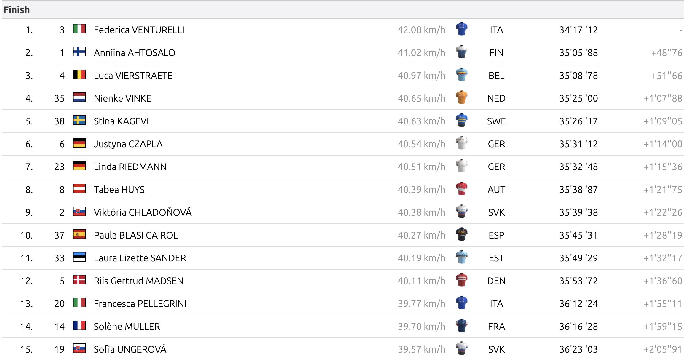 Sui suoi tempi c'è Luca Vierstraete (Belgio), mentre pagano oltre 20" sia Ahtosalo che Chladoňová