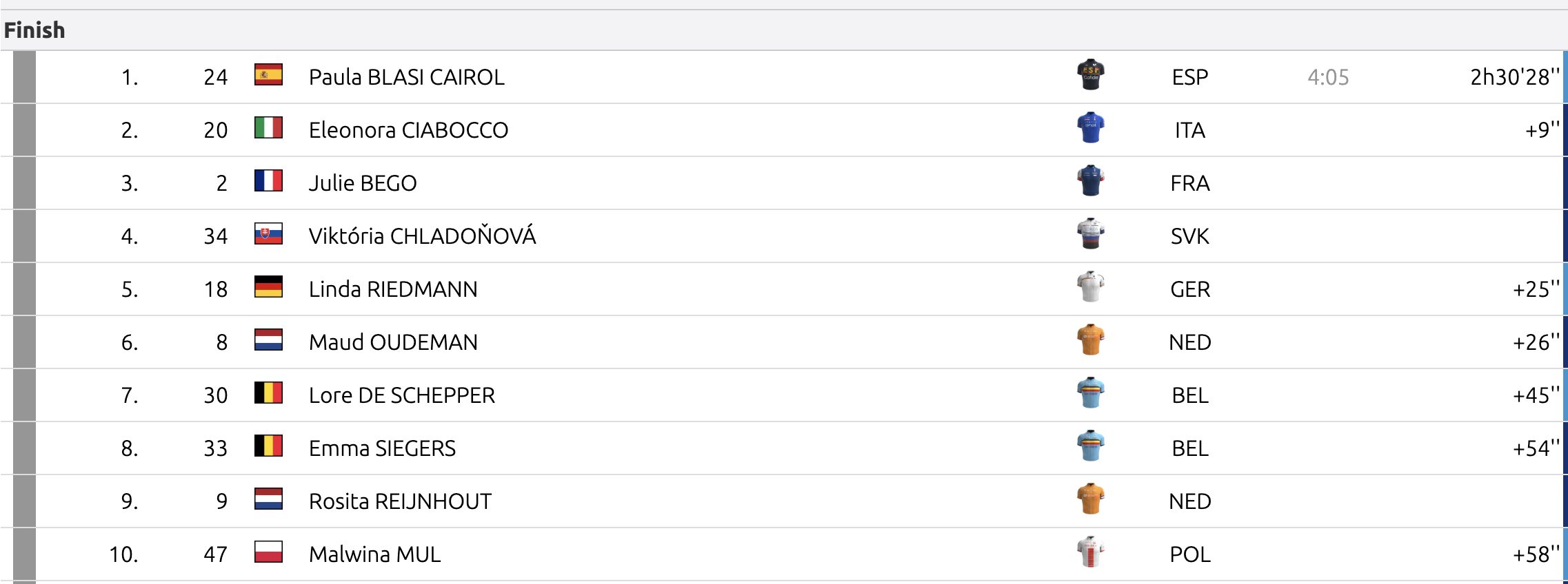 Purtroppo sono segnalate in ritardo sia Eleonora Ciabocco che Federica Venturelli, fresca campionessa europea a cronometro, transitate sotto il traguardo con 1'53" di ritardo dalla testa della corsa
