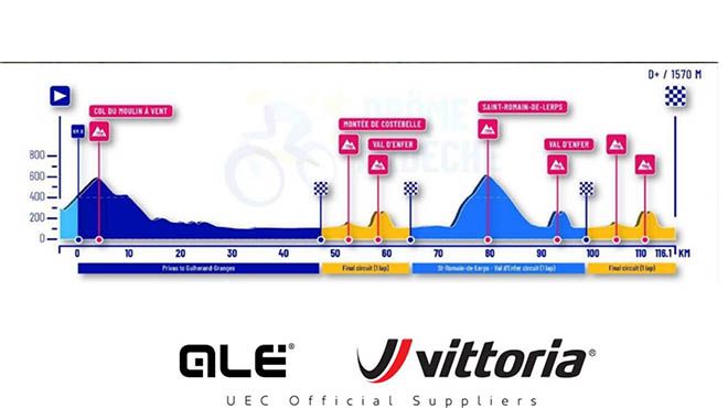 Diversa la conformazione del percorso rispetto alle altre prove in linea andate in scena finora: dopo la partenza da Privas, le donne, infatti, dovranno affrontare un primo tratto in linea di 47,4 chilometri con il Col du Moulin à Vent a fungere da trampolino di lancio per possibili fughe.