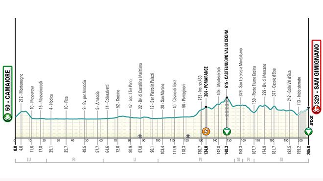 E' una tappa non poco impegnativa, soprattutto nella seconda parte. A partire dal chilometro 125 il gruppo affronterà una serie di su e giù, ma attenzione al finale con lo sterrato verso San Giminiano.