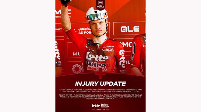 RITIRO. Il belga Lennert Van Eetvelt(Lotto Intermarché) non prenderà il via della seconda tappa, dopo alcuni giorni difficili seguiti alla caduta alla Strade Bianche e alla cronometro di apertura. Insieme al team medico e ai responsabili delle prestazioni, è stata presa la decisione di non correre rischi e di concentrarsi sul recupero, con l'obiettivo di tornare al massimo delle forze per il resto della stagione primaverile.