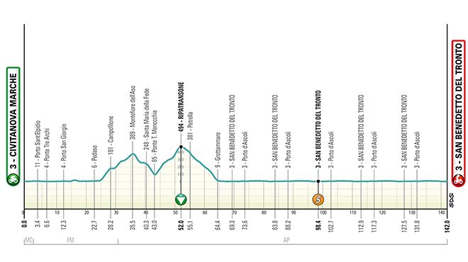 Partenza da Civitanova Marche, traguardo tradizionale a San Benedetto del Tronto dopo 142 km: sulla carta è tappa per velocisti.