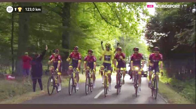 La Ineos schierata in testa al gruppo mentre si entra a Parigi.