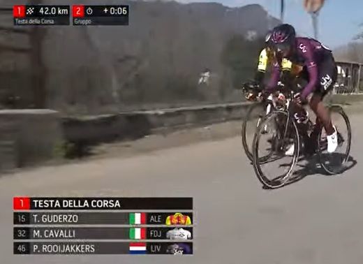- 39 KM AL TRAGUARDO. Sono ora in quattro al comando: Cavalli (FDJNouvelle Aquitaine), Guderzo (Alè BTC Ljubljana), Rooijakkrs ( Liv Racing) e Cordon Ragot (Trek Segafredo)