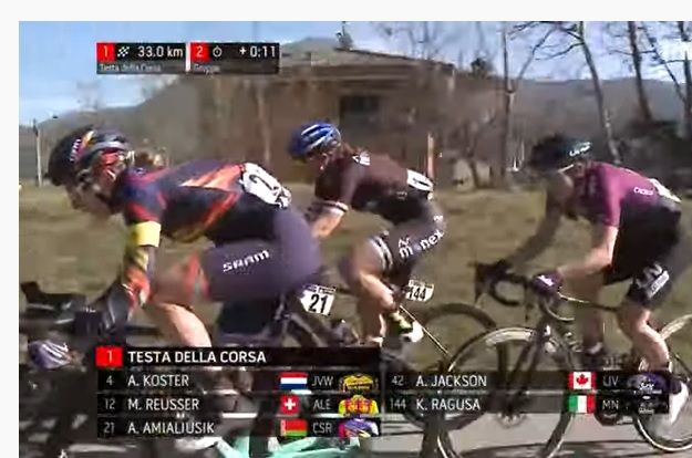 Il drappello di inseguitrici è composto da Vos (Jumbo Visma), Ludwig (FDJ), Mavi Garcia (Alè BTC Lujbiana), Nieviadoma (Canyon Sram) e Paladin (Liv) il loro ritardo a 2,5 KM AL TRAGUARDO è di 1'.00"